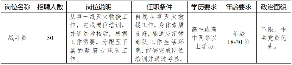 因工作需要,苏州市消防救援支队(常熟市消防救援大队)现面向社会公开招聘政府专职消防员50名,现将有关事项公告如下: