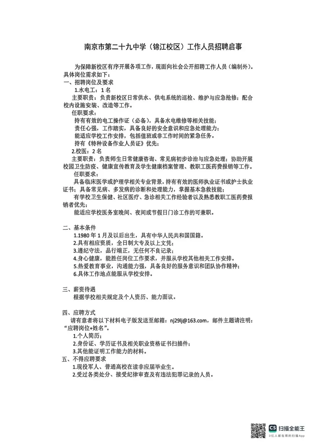 【声明】本公告来源于“南京市第二十九中学”,由“江苏医护招聘考试”公众号整理编辑,仅用于学习交流目的,若涉及侵权和错误信息,请扫描上方二维码联系予以更改或删除。