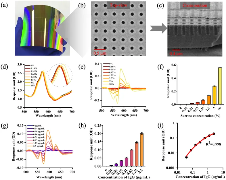 图2: MetaSPR传感器的均一性表征与性能验证,通过蔗糖折射率测试证实芯片高灵敏度,IgG特异性结合实验显示线性响应(R2=0.998)。
