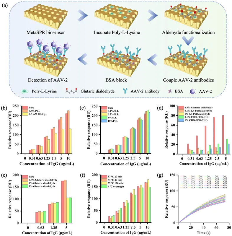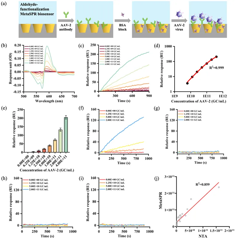 AAV作为基因治疗的核心载体,具有免疫原性低、表达稳定、安全性高等优势,在视网膜退行性疾病、帕金森病、肿瘤等多种疾病的治疗中展现出巨大潜力。然而,传统AAV质控方法存在检测耗时、操作复杂、无法实时监测等缺陷—ELISA需2 h且依赖酶标记,qPCR需复杂样品前处理,纳米颗粒追踪分析(NTA)灵敏度不足且重现性差,严重阻碍了AAV产业化进程。超表面等离子体共振(MetaSPR)技术凭借无标记、响应快速等优势,为解决这一难题提供了新路径。本研究通过醛基功能化修饰与双捕获策略优化,进一步提升了传感器的灵敏度、特异性与实用性,实现了AAV生产的全流程监测。