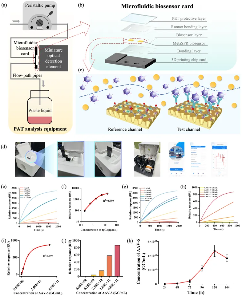 同时,利用肝素作为AAV-2天然受体的特性,研究人员开发了通用型捕获体系,解决部分血清型缺乏特异性抗体的难题。该体系对AAV-2的回收率达86.2%-102.3%,可再生10次且检测性能无衰减(图5)。此外,团队将ALMetaSPR芯片与微流控技术、智能手机接口集成,开发了便携式MSPR-PAT实时监测装备。设备含蠕动泵、LED单色光源、光电探测器及芯片卡,通过无菌采样回路直接对接生物反应器,可实时追踪分泌型AAV-5的生产动态,实现病毒浓度可视化监测(图6)。