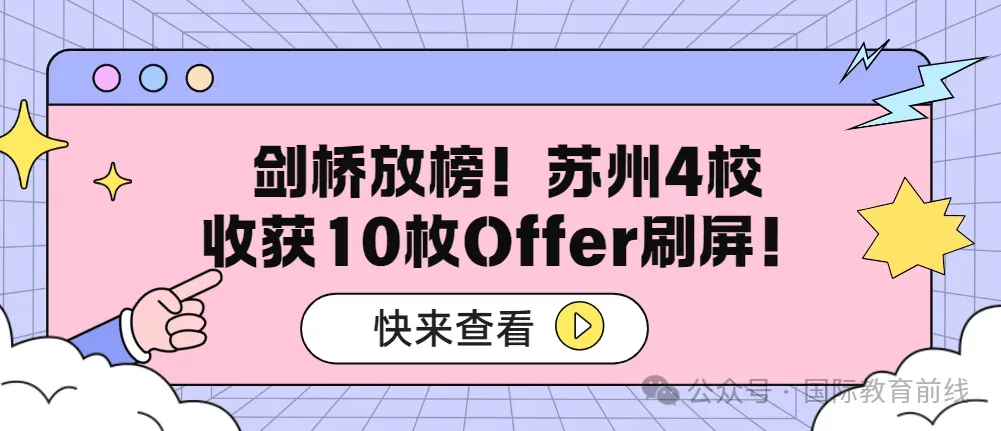 2026年1月28日,剑桥大学本科预录取结果正式揭晓,苏州国际教育界传来振奋人心的好消息!4所国际学校不负众望,一共拿下10枚剑桥预录取Offer,创下亮眼成绩。这几所学校究竟有何过人之处,能在激烈的竞争中脱颖而出?今天咱们就来好好聊聊这几所“牛校”,看看谁才是苏州真正的“牛剑收割机”!