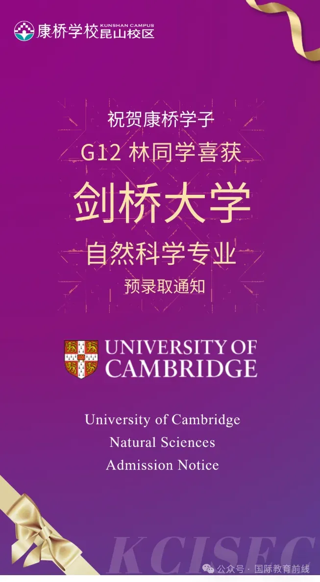 同时恭喜康桥学校昆山校区收获1枚剑桥自然科学专业预录取offer!