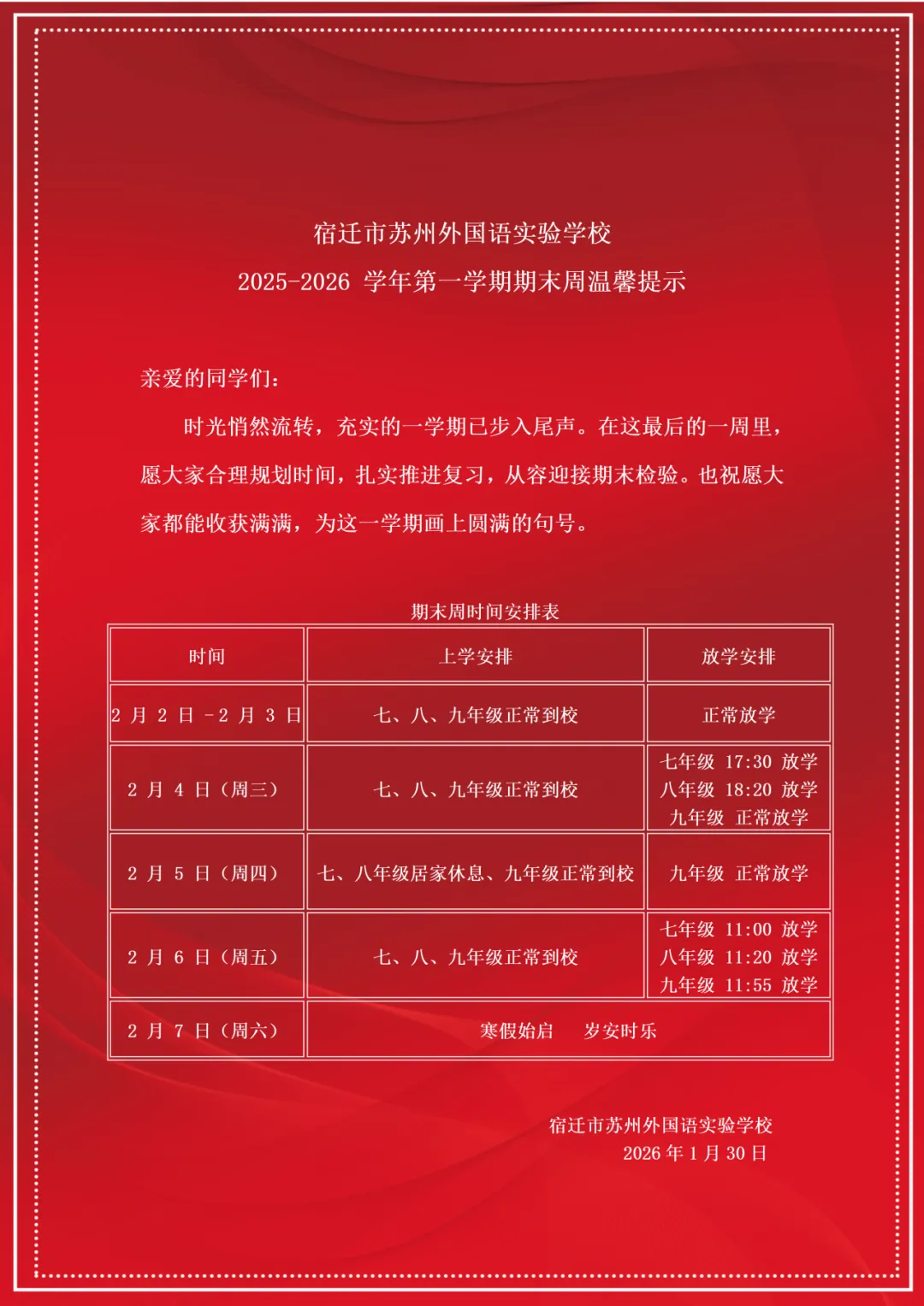 【宿苏外实验学校】宿迁市苏州外国语实验学校 2025-2026 学年第一学期期末周温馨提示