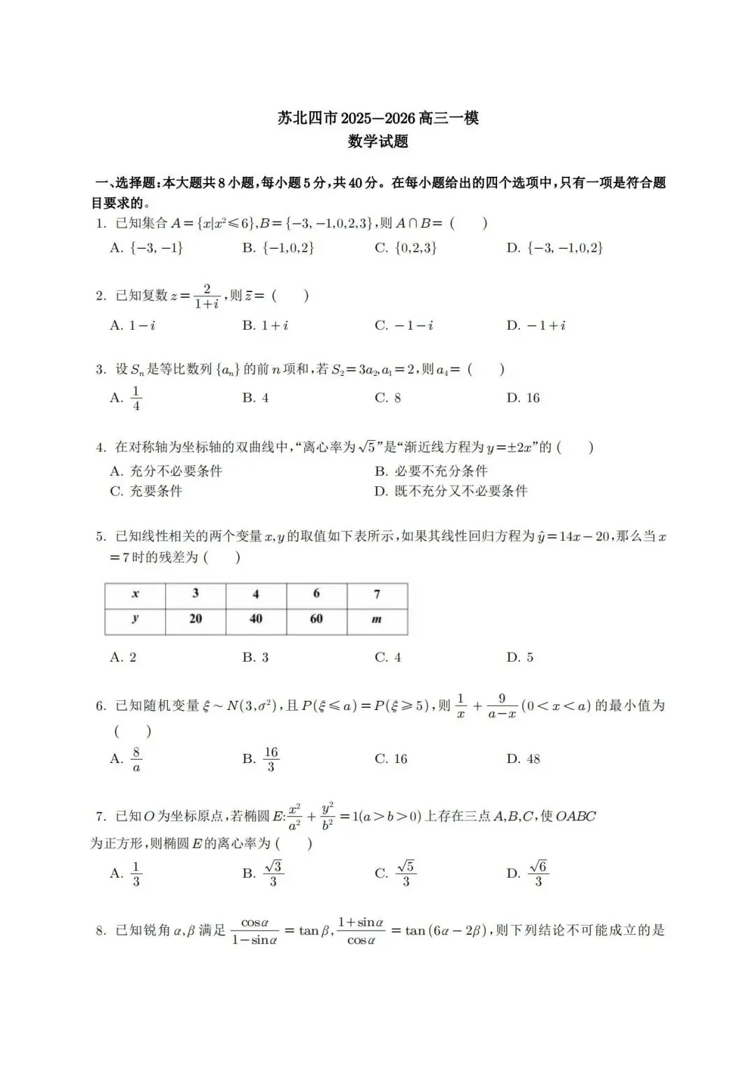 【高三名卷】优质模拟卷:江苏苏北四市(徐州、宿迁、淮安、连云港)2025-2026高三一模