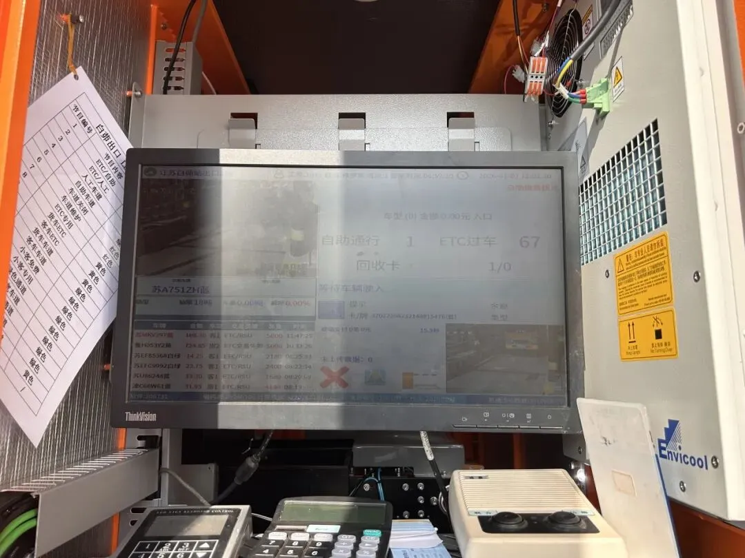 车道自助设备的内置显示屏,是现场工作人员获取交易信息、处理特情的重要窗口。然而,由于收费站各车道朝向不同,部分显示屏在特定时段操作时受阳光直射,容易出现反光现象,导致屏幕内容难以辨认,影响工作人员特情处置效率。针对“阳光盲区”的困扰,白茆收费站运维团队迅速行动,提出了低成本、易实施的优化方案:为受影响的显示屏加装可多向灵活调节的支架。改造后,工作人员可根据日照角度随时调整显示屏朝向,有效避免反光干扰,确保屏幕信息清晰可视。