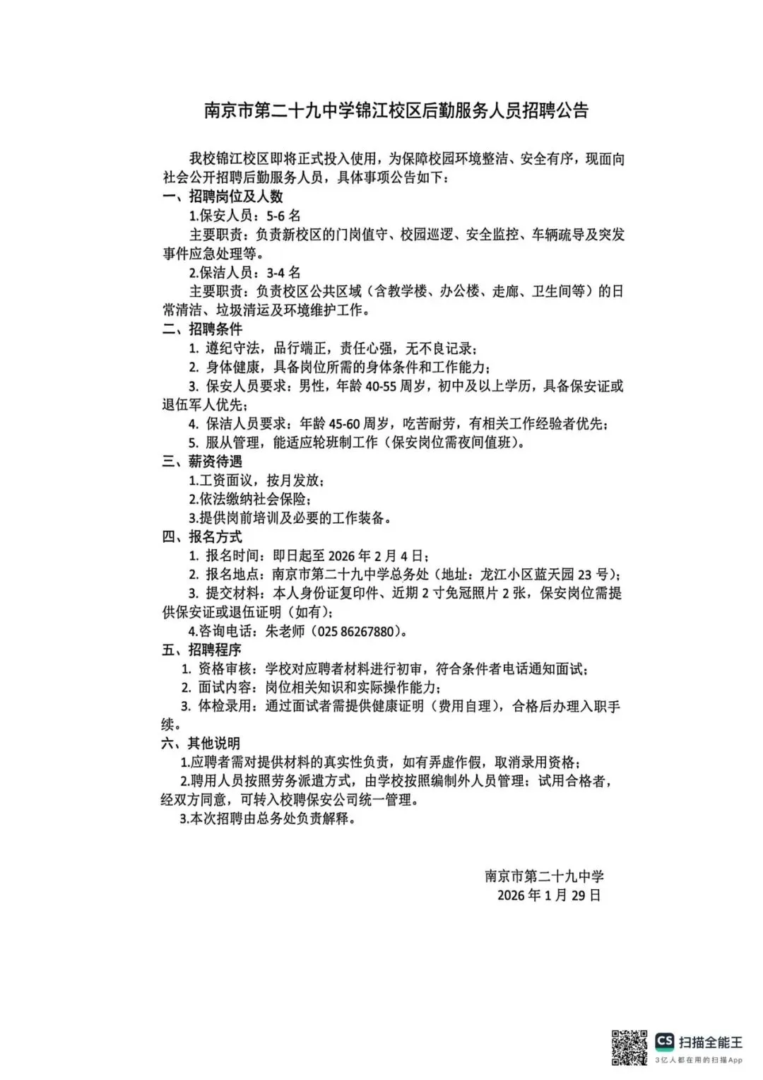 【声明】本公告来源于“南京市第二十九中学”,由“江苏社工招聘”公众号整理编辑,仅用于学习交流目的,若涉及侵权和错误信息,请扫描上方二维码联系予以更改或删除。