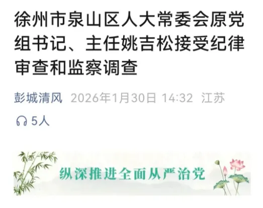徐州市泉山区人大常委会原党组书记、主任姚某松涉嫌严重违纪违法,目前正接受徐州市纪委监委纪律审查和监察调查。 这则通报如同一声惊雷,炸响了徐州政坛。这位曾在泉山风生水起的“一把手”,如今彻底告别了权力的巅峰,转身迈向了高墙电网的深渊。作为曾经掌管一方立法监督、经济开发的实权人物,姚某松的落马不仅是个人的悲剧,更是对权力缺乏敬畏的辛辣嘲讽。