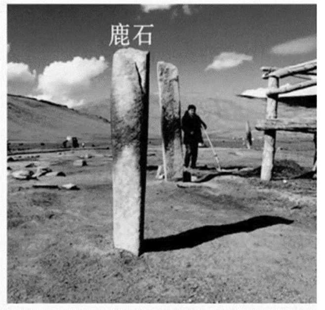 我国阿尔泰山海拔2700米处广泛分布十字轮辐状的石构文化遗址(46°48′N,90°51′E),下左图为“花海子一号”十字轮辐线与二至日日出日落指向线的位置关系图,下右图为某日遗址中鹿石正午景观图。据此完成下面小题。