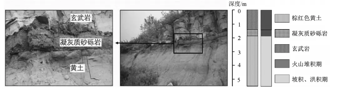 我国华北某地分布大量的低山丘陵,下图为该地地表玄武岩至地下5米多黄土纵剖面景观图及该处地质剖面图和不同时期堆积作用示意图。据此完成下面小题。