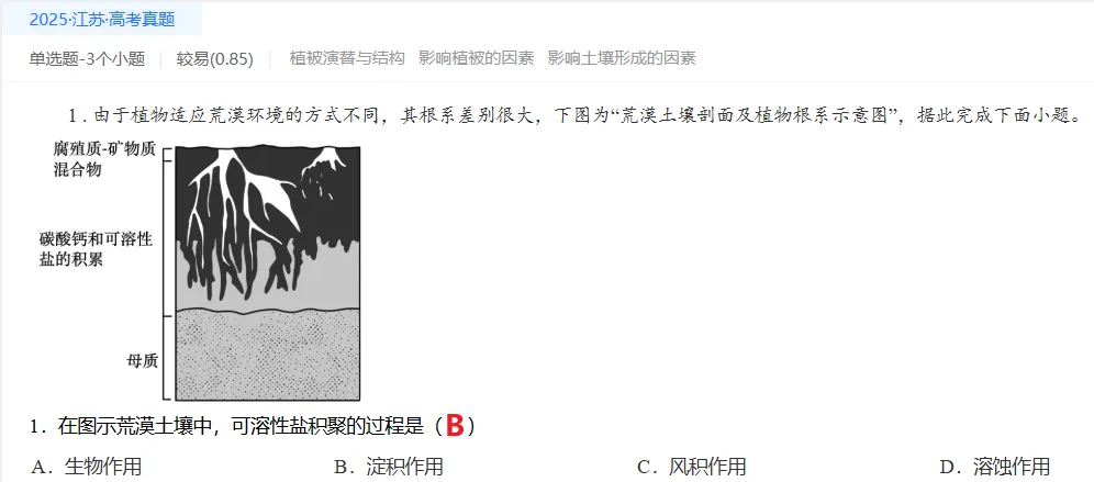此题更像是在考察对地理过程中不同概念的理解,有点类似于2025年江苏卷的土壤题目(如下)。