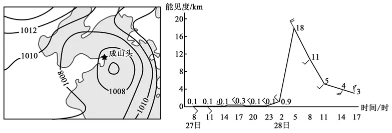 下左图为成山头观测站某年3月27日14时附近海平面等压线分布图,下右图为该地3月27至28日风向和大气水平能见度示意图。据此完成下面小题。