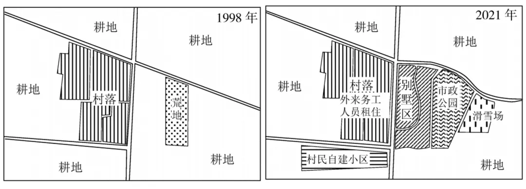 河北省某村位于城市郊区,有户籍人口约4600人。由于距离中心城市较近且房租低廉,该村还容纳了9000多名外来人口暂住于此,下图分别是该村1998和2021年的空间形态。据此完成下面小题。