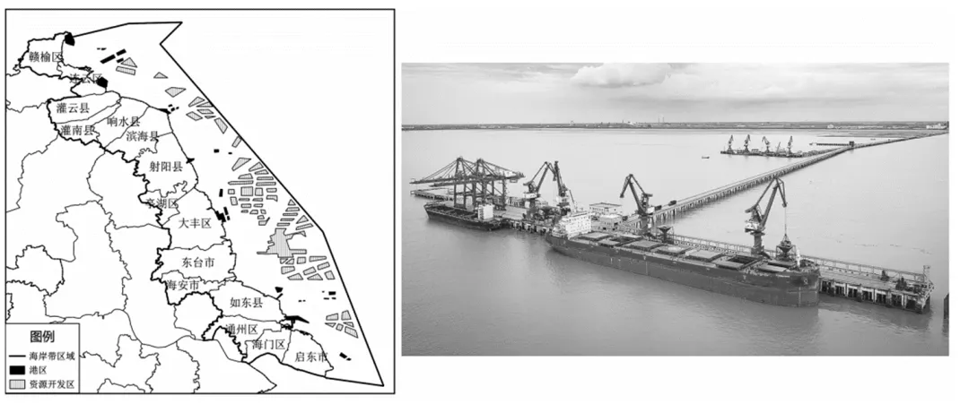 海岸带是指海岸线向海陆两侧扩展到一定宽度的带状区域,下左图为江苏省海岸带及海洋空间功能区示意图,下右图为江苏沿海某港口景观图。据此完成下面小题。