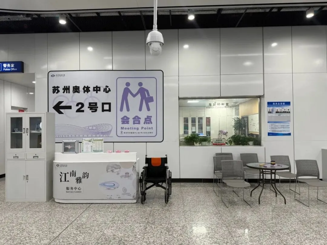 为保障乘客当天出行的通畅,苏州奥体中心站工作人员提前做好多重客流保障措施,在车站出入口、闸机、扶梯等关键点设置引导标识并现场安排人员引导、增加警力保障,以方便乘客快速进出站。除此之外,车站还在江南雅韵服务中心为乘客提供爱心预约、爱心轮椅、医药箱等一系列服务,我们将竭诚为您服务!