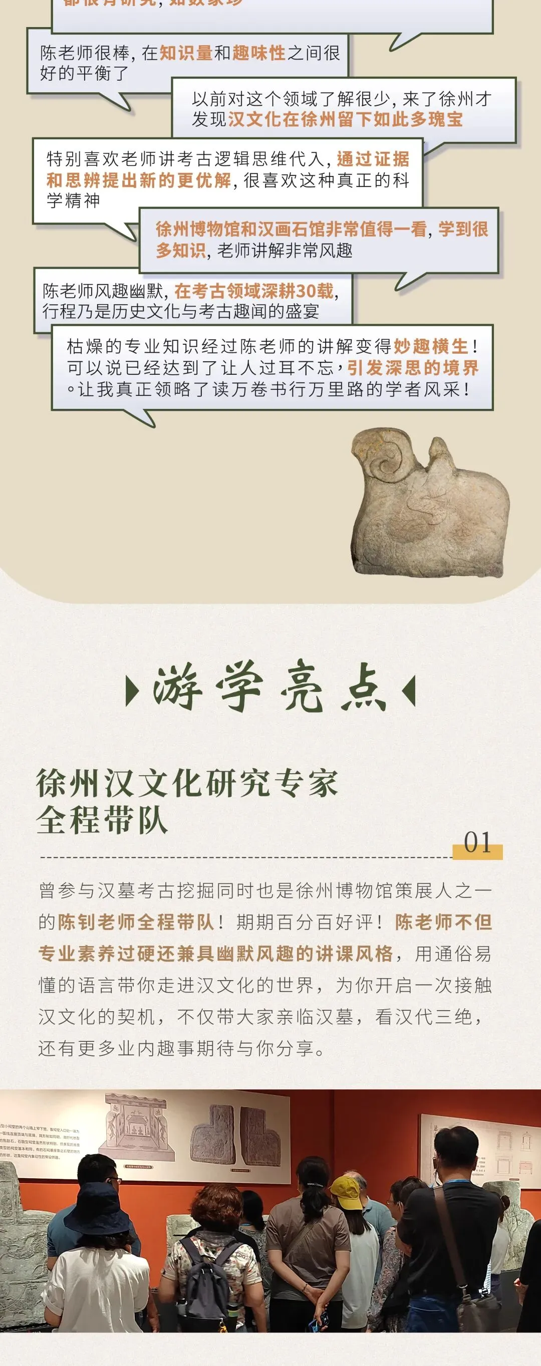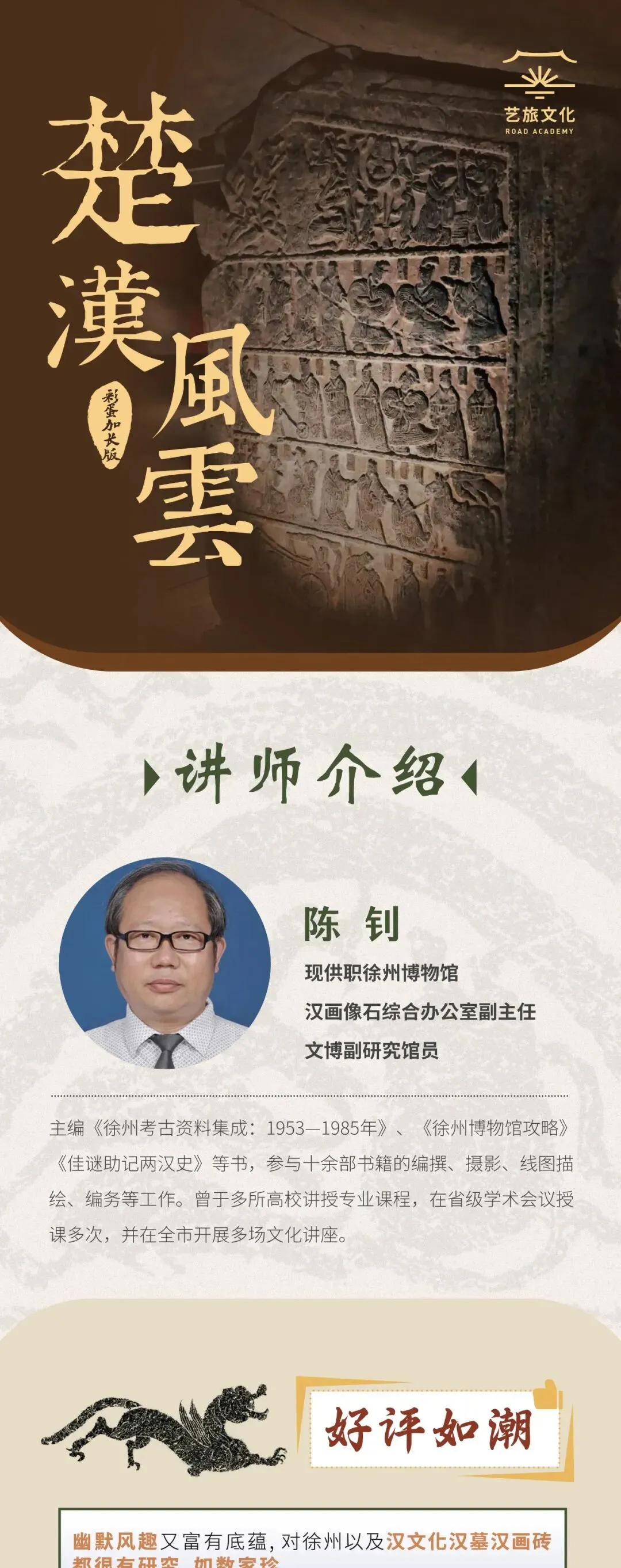 武氏祠·子母汉阙 图源/金晚面对如此厚重的历史,一位好的引路人至关重要。我们特邀的陈钊老师,正是这样一位优秀的讲述人,他不仅是徐州博物馆的副研究馆员,更亲身参与过多次考古发掘。从一块画像石上的「烧烤宴席」讲到汉代的饮食风尚,也能在分析墓室结构时,调侃古人的「户型设计焦虑」。陈老师会用最热情的态度、最专业的知识储备、最风趣幽默的语言,带你走进两汉四百年风云!