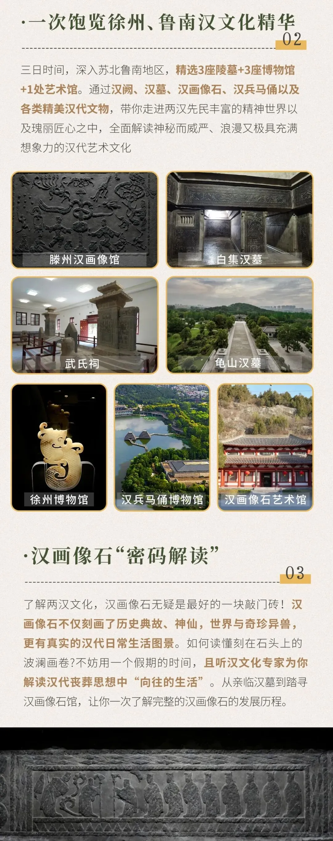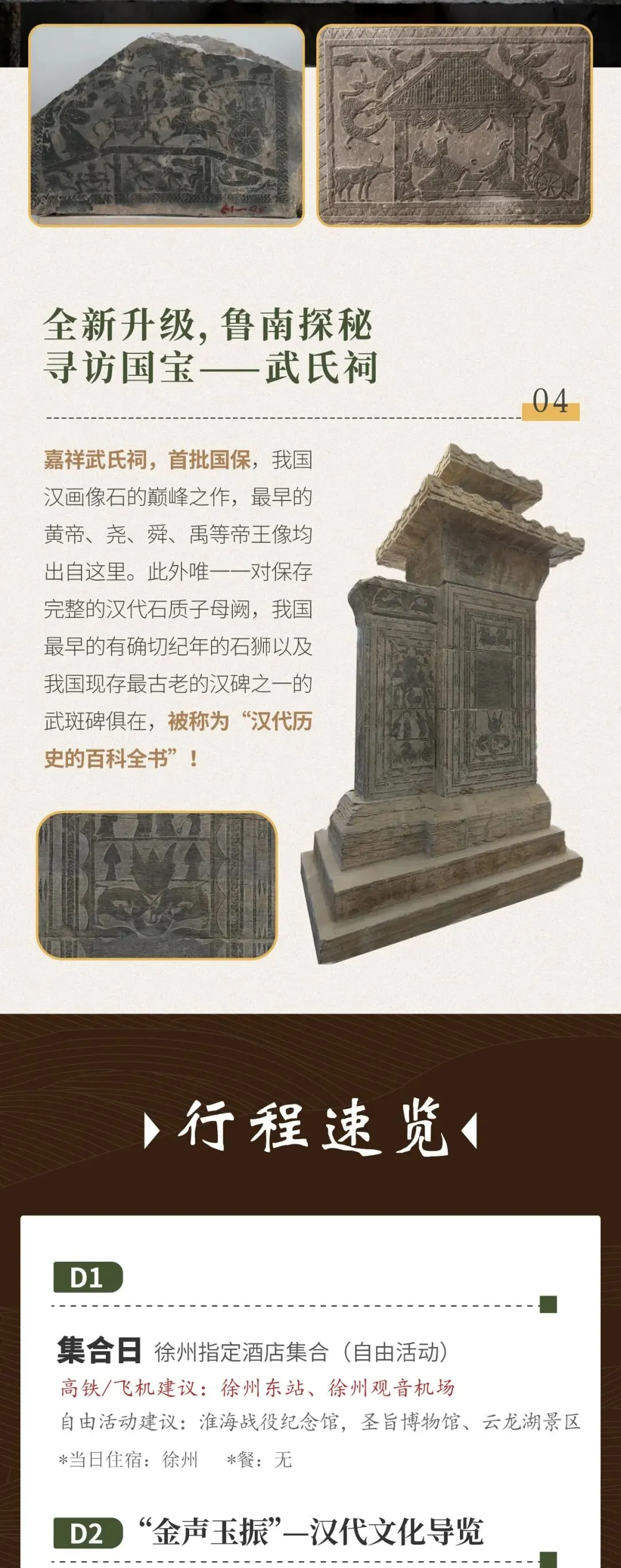 此外我们特意设计一天鲁南地区汉画像石、汉阙、汉代文物大赏!前往探索与故宫齐名、首批国保嘉祥武氏祠,观赏汉画像石巅峰之作,欣赏全国唯一保存完整的汉代石质子母阙、最早纪年石狮与古老汉碑,完成一场深度的汉文化巡礼。