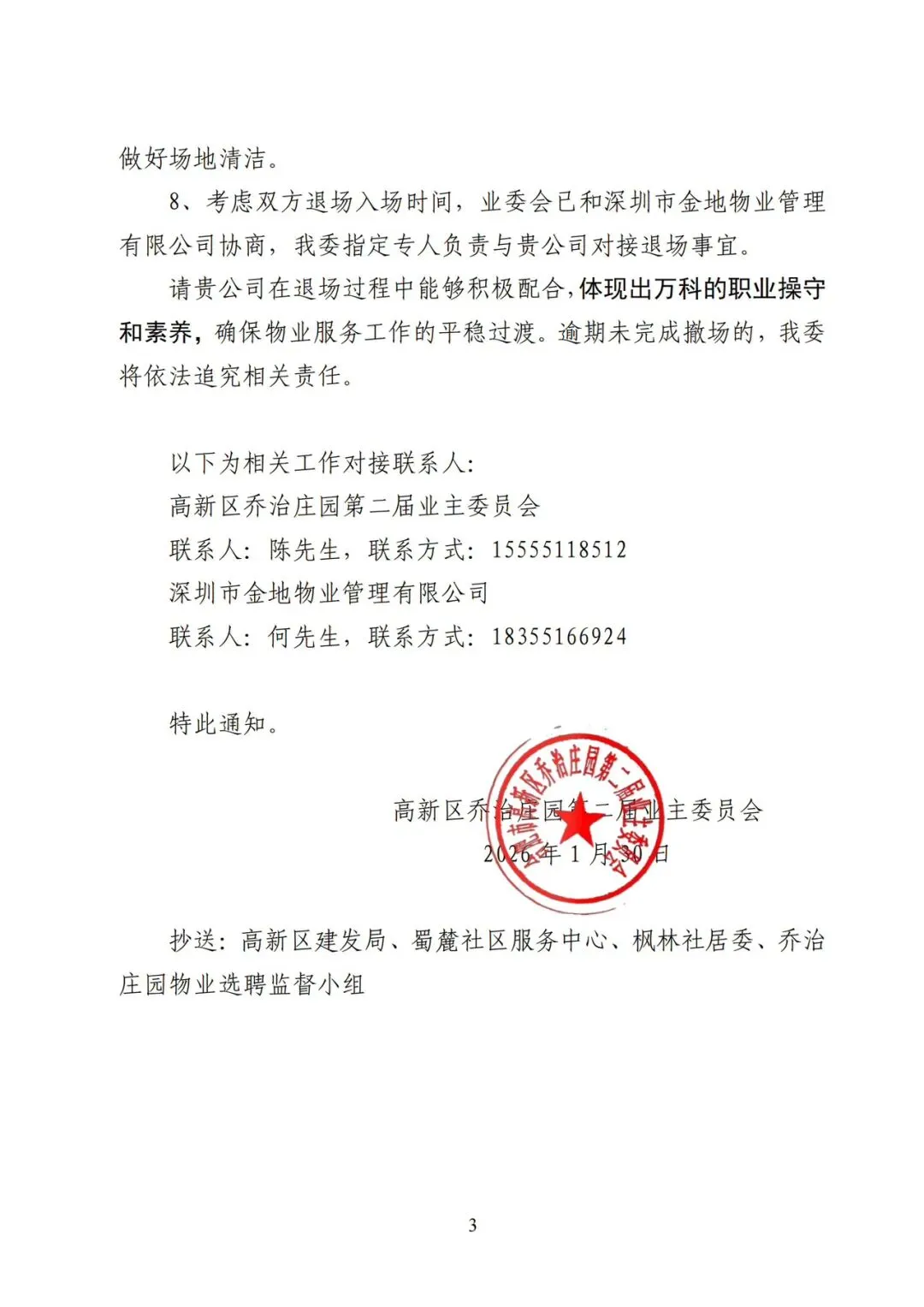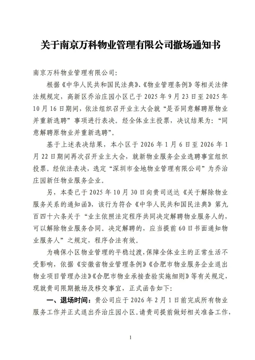 关于南京万科物业管理有限公司撤场通知书