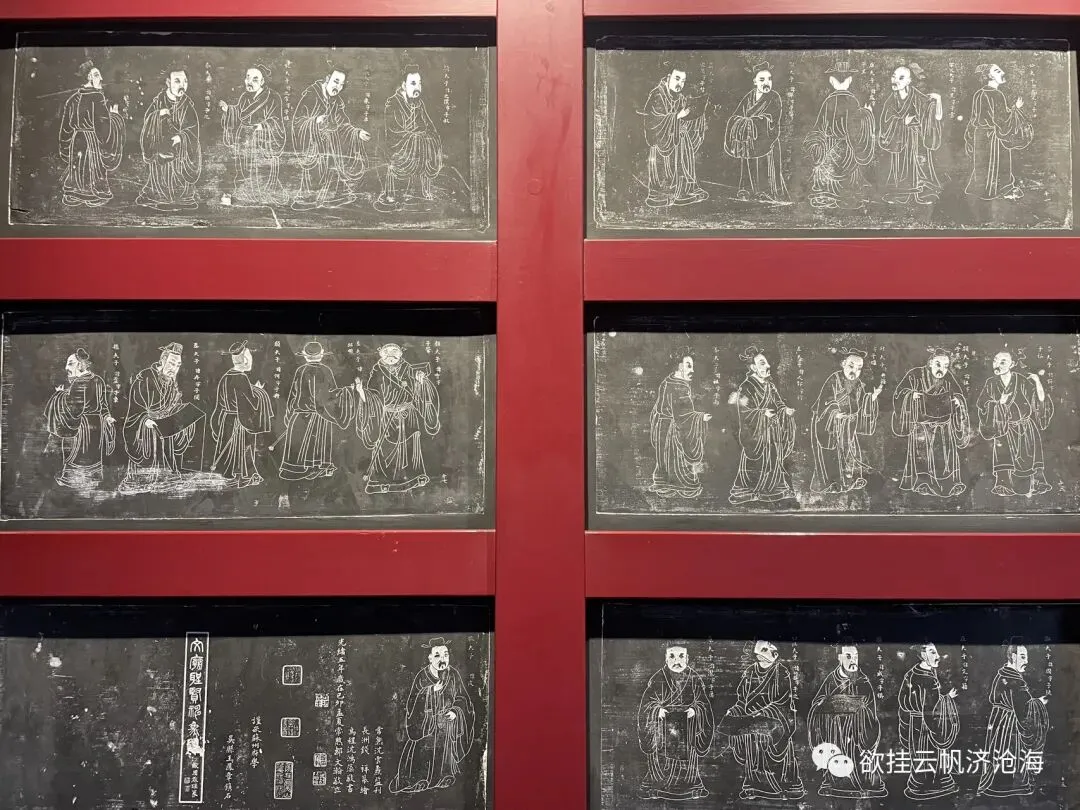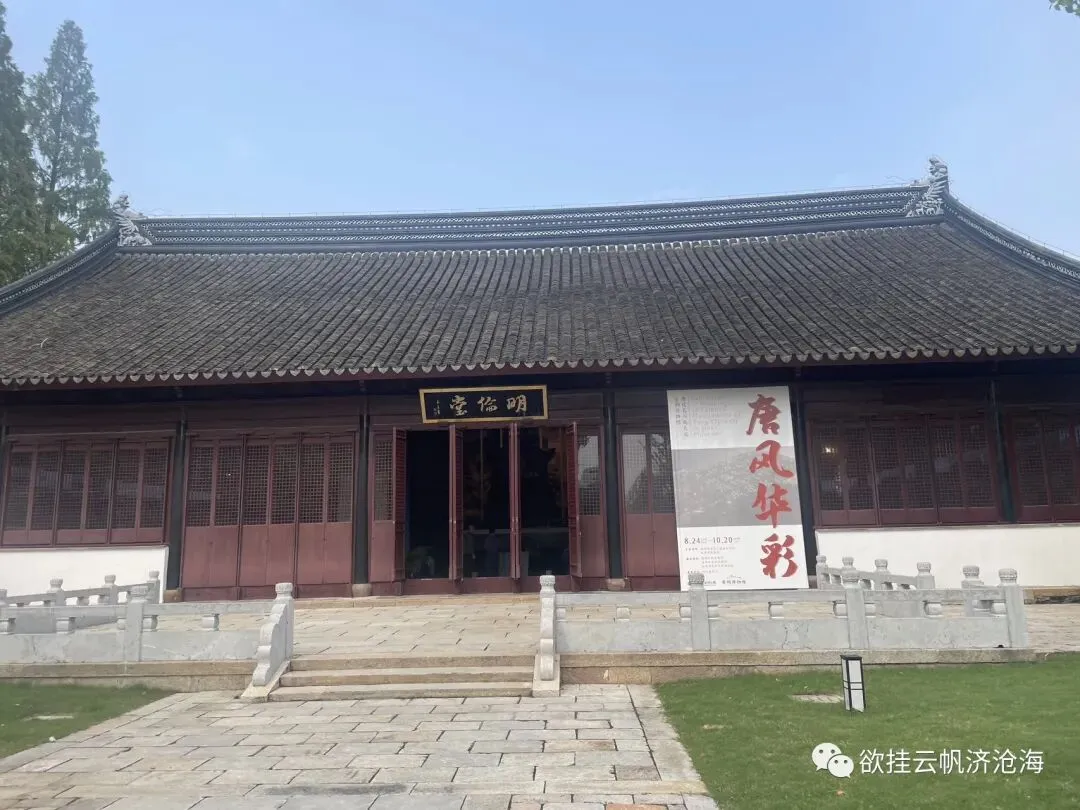 然后往西面庭院走去,两侧也是碑廊,最后一座建筑明伦堂。有晋祠的拓片“唐风华彩”展,明伦堂内范仲淹的雕像一身正气,上书一世之师。那些晋祠的拓片让我重温了一下。看了才知道奉圣寺还有武则天的唐碑。当时在那也没留意。