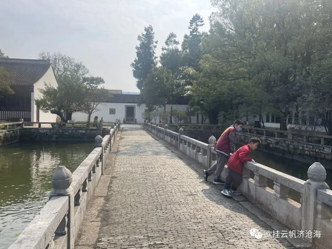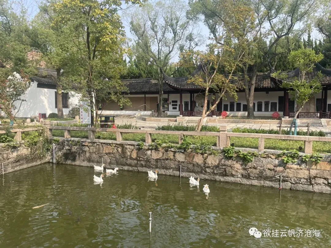 看完出来,庭院里有个七星池,中间一座七星桥。桥长35米,桥面砖石路走起来感觉颇好。池里养了几只大白鹅,还有几条锦鲤。大白鹅叫的开心,只听两个看鹅的小朋友说“这个鹅这么吵 ,范仲淹在房间里写诗 ,听见鹅叫,吓了一跳 ,字都写糊了”。我在想这群鹅将来结局不知道便宜了谁。