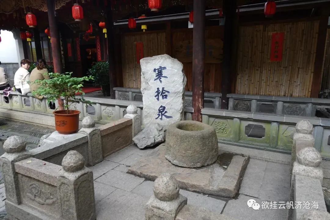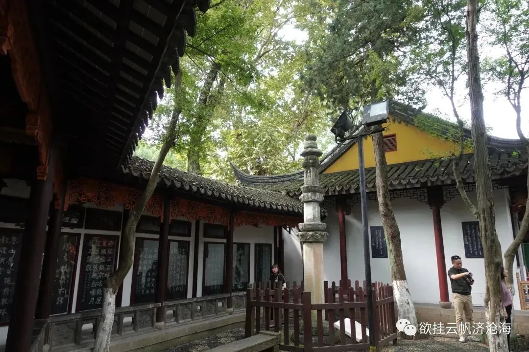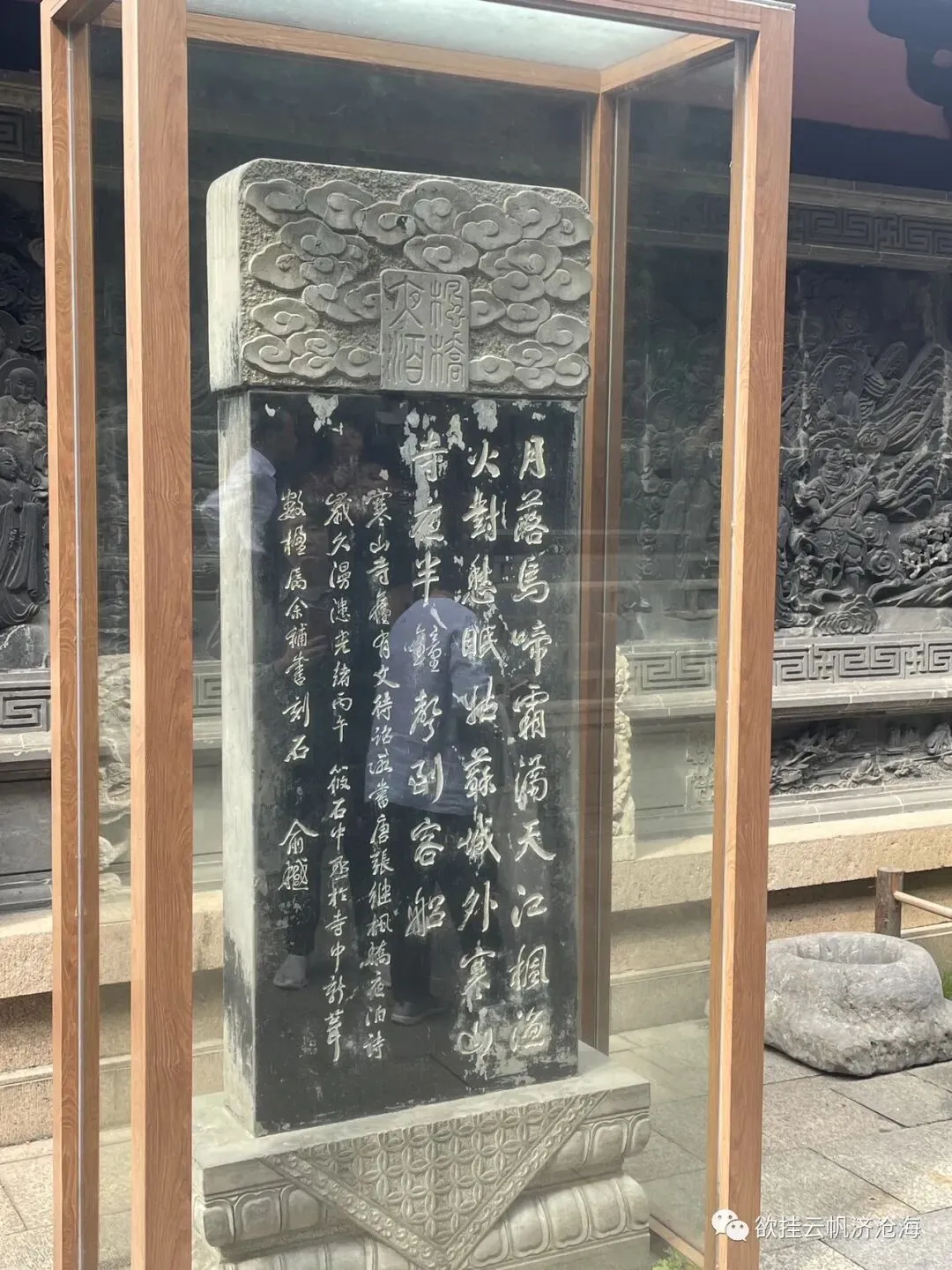 院子右侧有宋代的石幢和碑廊,碑廊内有俞樾所书枫桥夜泊的碑,还有岳飞的诗碑“三声马蹀阏氏血,五伐旗枭克汗头”,说是岳帅真迹。碑廊外还有块性空手书枫桥夜泊的碑。大雄宝殿后方就是寒拾殿 ,供了寒山拾得像,传说求姻缘很有特效,背面是千手观音的石雕图,也是别具风格。