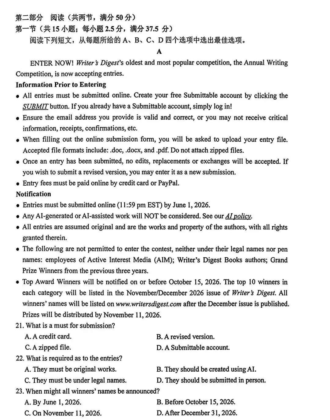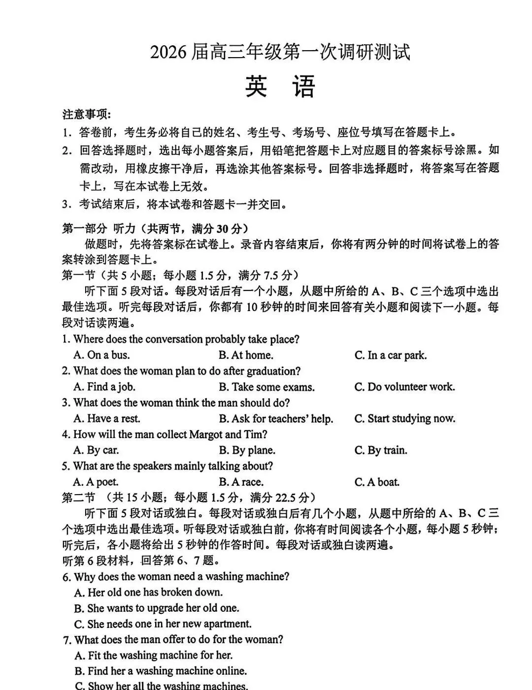 本周好题|2026姐江苏省南京市、盐城市高三(上)期末英语试卷(一模)
