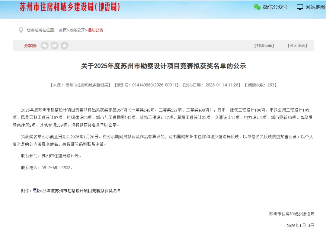 近日,苏州市住房和城乡建设局正式公布《2025年度苏州市勘察设计项目竞赛拟获奖名单》,苏交集团设计研究院(苏州市慧杰工程设计有限公司)申报的《夏驾园小学配套道路新建工程设计项目》成功入选,荣获三等奖。