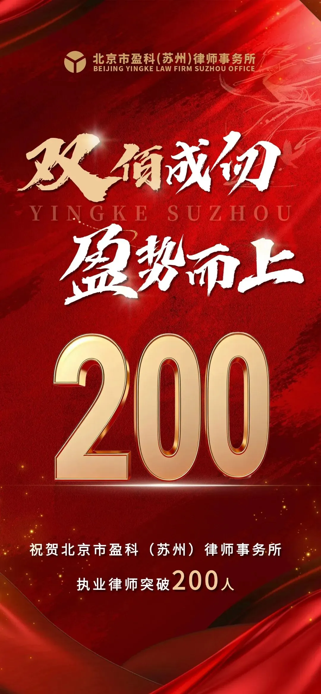 当前,苏州律师行业蓬勃发展,法律服务需求日趋多元化、国际化,恰逢律所15周年庆典在即,我们将以此次执业律师突破200名为新起点,以十五载积淀为根基,继续坚守法律服务初心,持续优化人才梯队建设,深化专业化、数智化转型,依托盈科全球资源优势,整合优质法律服务力量,为苏州企业发展、法治建设注入更加强劲的盈科力量。