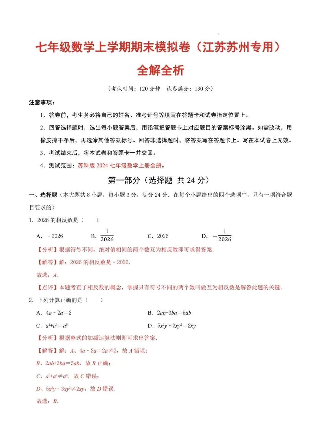 【今日分享】2025-2026学年七上数学期末模拟卷(江苏苏州专用,苏科版)