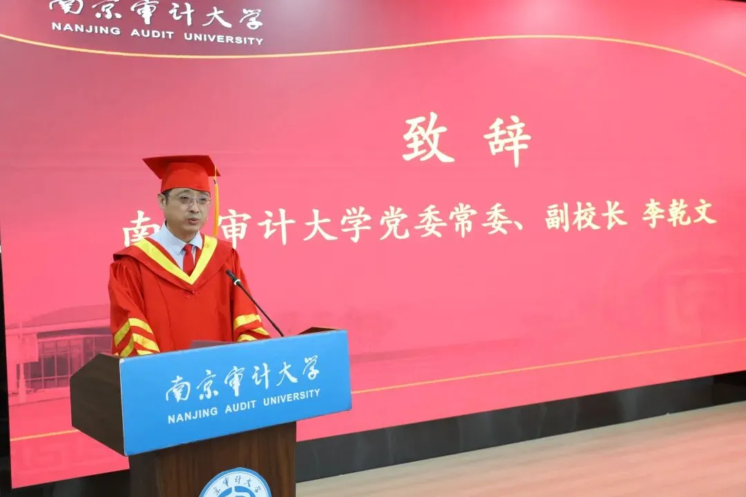 李乾文代表学校向全体毕业生致以热烈祝贺。他在致辞中充分肯定了2025届毕业生克服工学矛盾,以"诚信、求是、笃学、致公"的校训精神完成学业。勉励大家:永葆审计人本色,做经济安全的忠诚卫士;坚持终身学习,适应智能化时代需求;胸怀家国,在现代化建设新征程中建功立业。