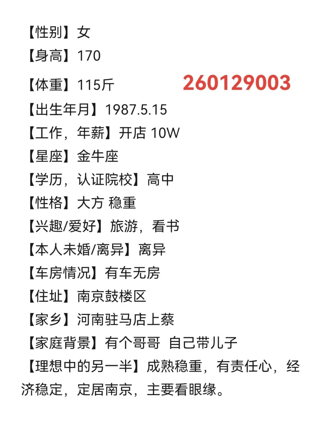 >南京相亲丨87年,女,离异,身高170,开店,河南人在南京鼓楼区