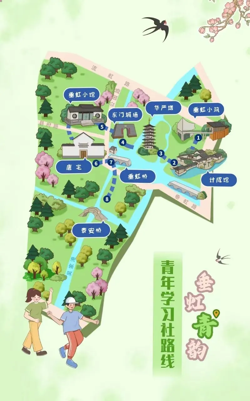 “垂虹青韵”青年学习社线路以“青年续文脉·古韵焕新生”为主题,全长约1.5公里,串联起垂虹小筑、计成馆、华严塔、东门城墙、垂虹小馆、唐宅、垂虹桥、泰安桥等8个核心点位,形成了一条集“历史保护-数字活化-社区共创”于一体的文化传承实践链。