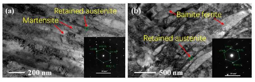 ((a) 马氏体板条和薄膜状残余奥氏体(b) 贝氏体铁素体板条和薄膜状残余奥氏体)