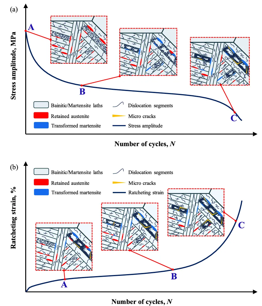 无碳化物贝氏体钢轨钢因其高强度、高韧性和优良的抗滚动接触疲劳性能,逐渐成为替代珠光体钢的理想材料。然而,在循环载荷下,材料内部会发生马氏体相变与损伤累积,二者相互作用导致材料性能退化。