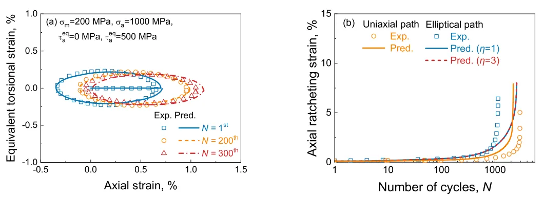 应力控制条件下椭圆加载路径的实验与预测结果:(a)等效扭转与轴向应变;(b)不同加载路径下轴向棘轮应变的演变曲线。