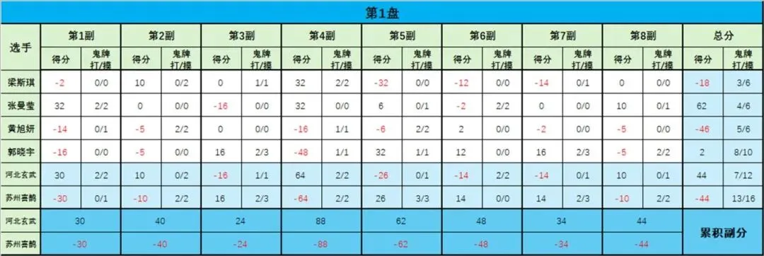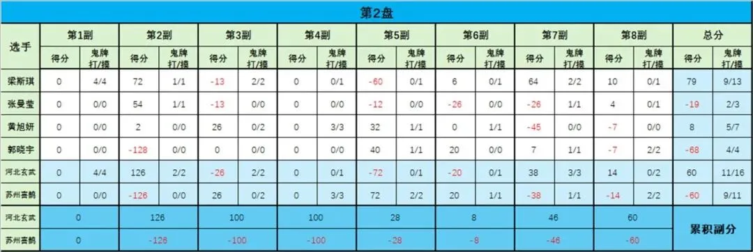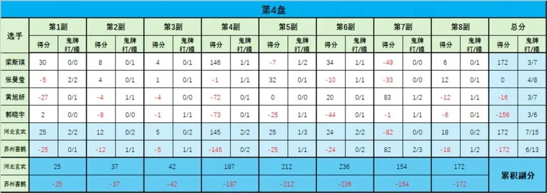 第4盘第1副:郭晓宇(苏州喜鹊)胡梁斯琪(河北玄武)点,门清,无鬼;梁斯琪(河北玄武)胡黄旭妍(苏州喜鹊)点,混一色,打2鬼无鬼;黄旭妍(苏州喜鹊)自摸,碰碰和,有鬼