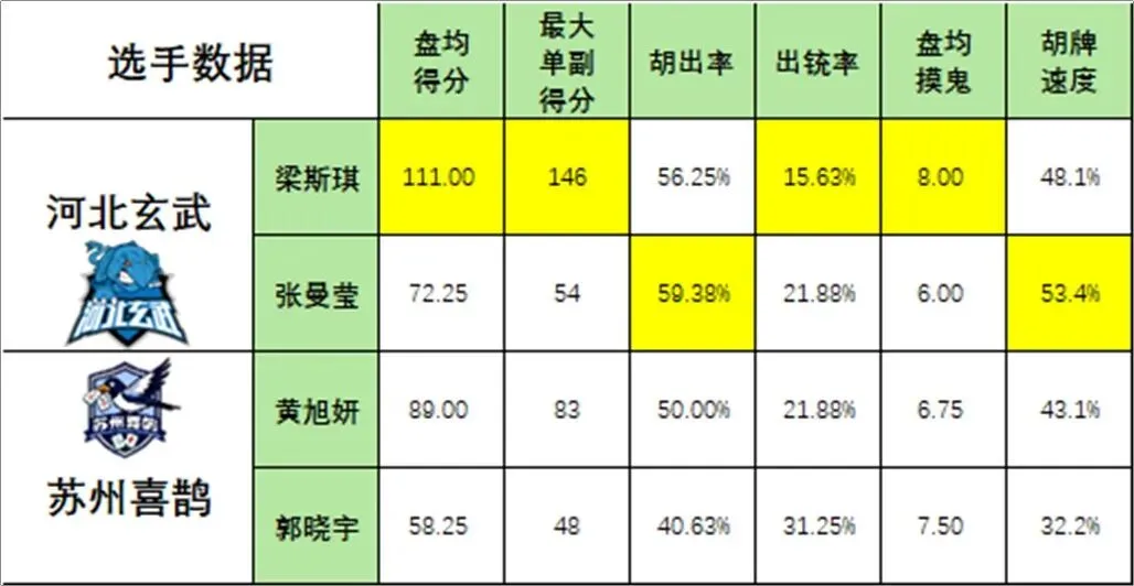 第4盘第3副:张曼莹(河北玄武)胡郭晓宇(苏州喜鹊)点,门清,有鬼;梁斯琪(河北玄武)胡黄旭妍(苏州喜鹊)点,混一色,有鬼