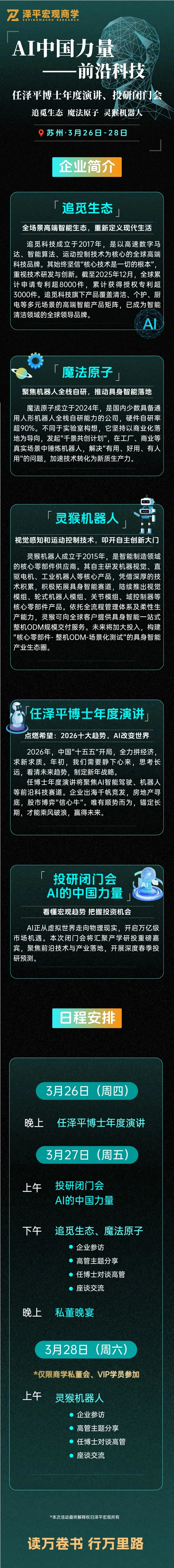 ![]() | 3.27(周五)下午 追觅生态+魔法原子 · 企业参访 · 高管主题分享 · 任博士对谈高管 · 座谈交流 3.27(周五)晚上 · 私董晚宴 | |