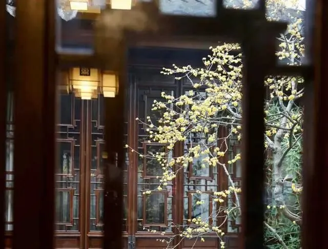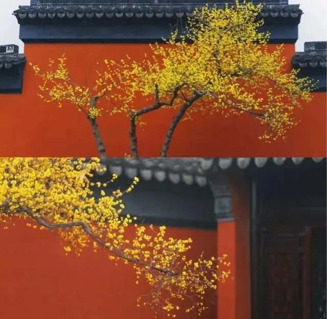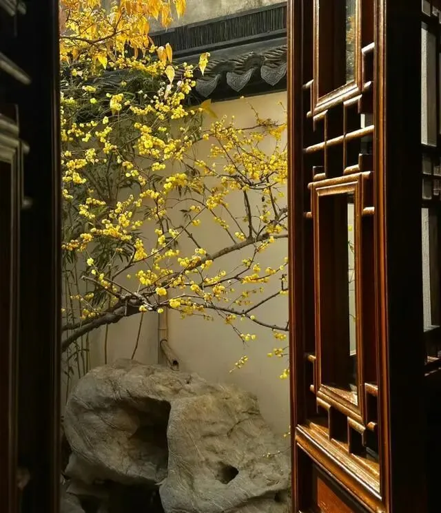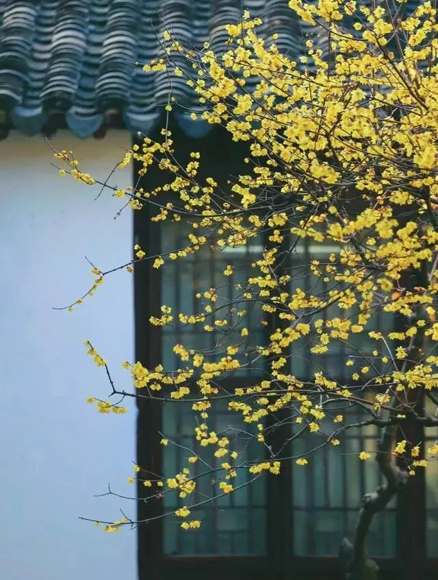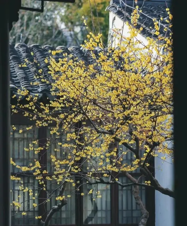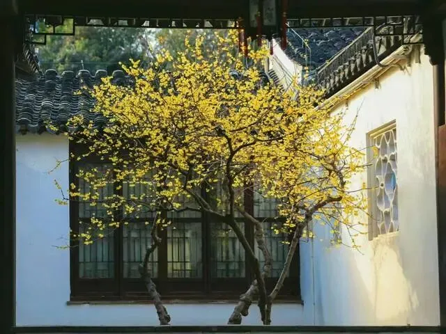 腊梅的美在苏州园林达到顶峰,独特的枝干姿态和空灵的花朵与中式古典园林建筑相得益彰。