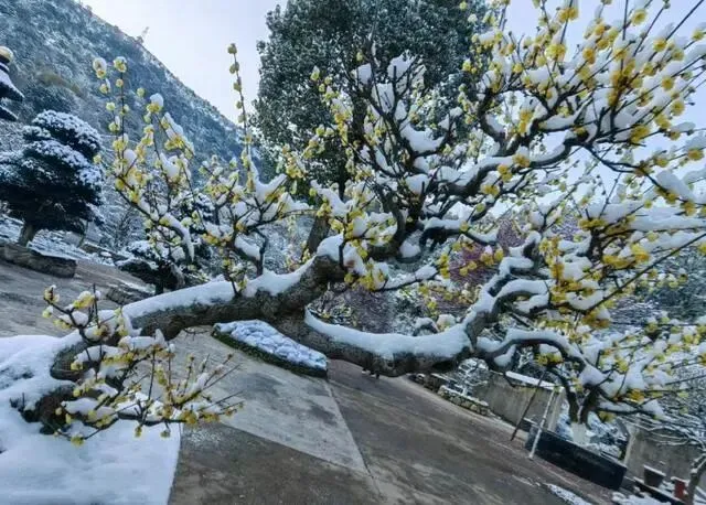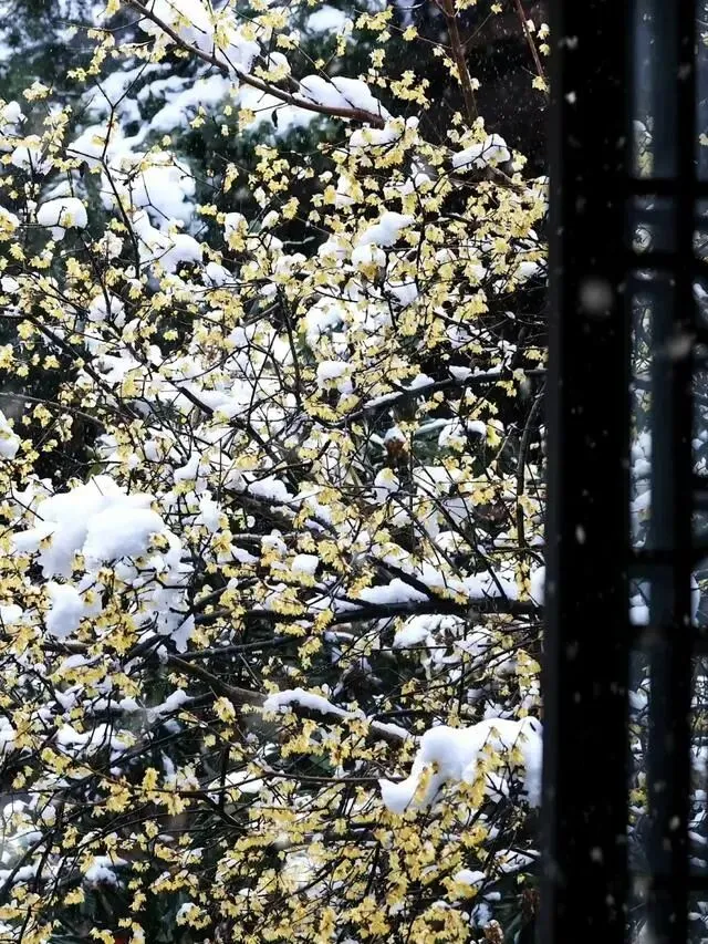 腊梅通常于寒冬盛开,恰逢江南大雪纷飞的时节,明黄的花朵遇上清冽的冰雪,则是另一番美景。