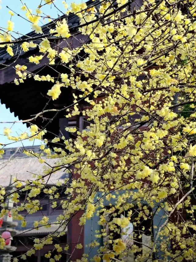 这棵腊梅位于苏州市吴江区黎里古镇昭灵观,植株不算高大,但姿态空灵,寥寥数枝,横疏斜影,金黄色的花,红墙作配,外加古色古香的瓦顶和窗棂,随手一拍,每一帧都是古典中式宫廷风。