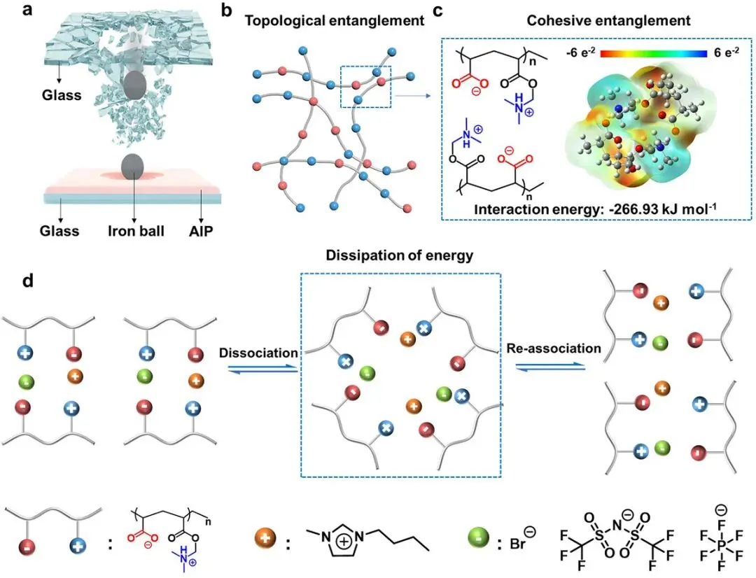图1 高模量和高阻尼AIP结构设计及能量耗散机制的示意图。a)AIP涂层冲击能量耗散示意图。AIP涂层可以耗散铁球的动能以保护玻璃。b)AIP的拓扑纠缠与离子相互作用。c)AIP的内聚纠缠。密度泛函理论(DFT)计算表明,一对相反电荷之间形成的单一离子键的相互作用能为-266.93 kJ mol−1.d) 撞击后AIP离子键的解离、重组和恢复过程的示意图示。
