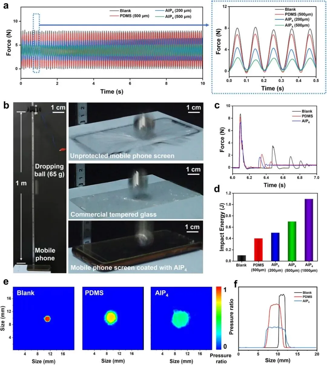 图2 聚合物段动力学的表征。a)基于时间-温度叠加原理(TTS)向参考温度20°C进行AIP的流变特性分析。b)AIP的阻尼系数。c)AIP的移位因子。d)由阿累尼乌斯方程拟合的AIP的活化能。e) AIP的自由归纳衰减(FID)曲线0通过低场核磁共振获得的PAAc和偏偏偏差分析。f)由FID曲线获得的各聚合物段的弛豫时间。g) AIP中刚性、中性和柔性段的比例0、PAAc和PDEA。图3 力学性能表征。a) AIP0、AIP1、AIP2、AIP3 和 AIP4 的压缩应力-应变曲线(压缩速率:10 毫米/分钟)。b) AIP4 在不同压缩速率(0.2、1、5 和 25 毫米/分钟)下的循环压缩应力-应变曲线。c) AIP4 在不同压缩速率(0.2、1、5 和 25 毫米/分钟)下的韧性和杨氏模量。d) AIP 与已报道的代表性韧性离子凝胶和水凝胶的压缩应力和应变的比较。e) 在不同应变速率(1200、1500、1800、2300 和 2700 秒^-1)下的分离霍普金森压力杆测试,相应的冲击压力分别为 0.01、0.02、0.05、0.08 和 0.10 兆帕。f) AIP0、AIP1、AIP2、AIP3 和 AIP4 在应变速率 2300 秒^-1 时的冲击韧性,以及 AIP4 在应变速率 1200、1500、1800、2300 和 2700 秒^-1 时的冲击韧性。图4 AIP(抗冲击保护材料)的冲击防护演示。a) AIP4(厚度分别为 200 微米和 500 微米)和 PDMS(厚度为 500 微米)的振动控制曲线。b) 未加保护的手机屏幕(一个 65 克的铁球从 1 米的高度落下)、一款商业钢化玻璃屏幕保护膜以及涂有 AIP4(200 微米)的手机屏幕(一个实心钢球从 1 米的高度自由下落以施加冲击能量)。c) 机械传感器检测掉落钢球冲击的力-时间曲线。d) 不同涂层下玻璃所能承受的最大冲击动能。e) 使用压敏纸对不同涂层下的冲击力进行的可视化表示。f) 不同涂层下压敏纸沿纵向的冲击力比例。在本研究中,我们制备了兼具高模量和优异阻尼性能的 AIP 材料。其模量和阻尼性能可通过内聚缠结进行精确调控,这种调控机制主要依赖于侧链离子相互作用。通过调整抗衡离子的数量和类型,我们能够精确控制刚性和柔性的成分之间的平衡——这不仅会影响玻璃化转变温度,还能使材料性能得到定制化。所得到的 AIP 涂层集高阻尼、高模量和光学透明度于一体,为易碎材料提供了卓越的抗冲击保护。这项工作提出了一种设计先进聚合物的通用策略,具有在防护涂层和振动控制系统中的广泛应用前景。