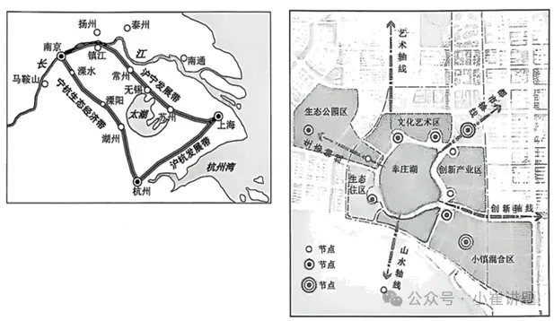材料一:长三角地区依托高铁、城际铁路等轨道交通,推动区域一体化格局形成。近年来,南京溧水区借助宁杭生态经济带,积极推进城南片区城市创新空间建设,引导人才、技术、知识等创新要素在空间上高度集聚。图左为“长三角经济发展带示意图”。