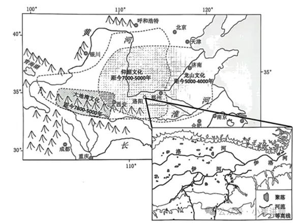 材料二:图为“中国新石器时代主要文化区的地理分布略图”及“洛阳盆地仰韶文化聚落遗址分布略图”。