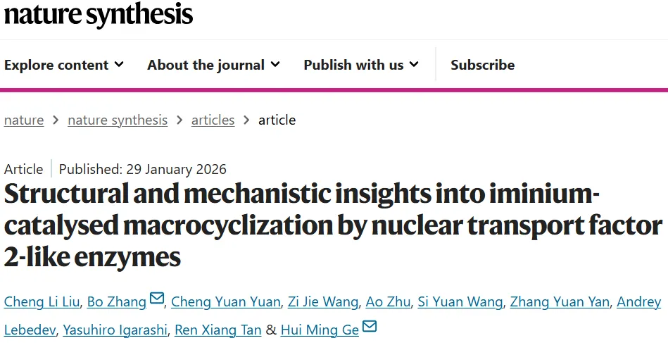 2026年1月29日,南京大学戈惠明、张博在国际知名期刊Nature Synthesis发表题为《Structural and mechanistic insights into iminium-catalysed macrocyclization by nuclear transport factor 2-like enzymes》的研究论文,ChengLi Liu为论文第一作者,戈惠明、张博为论文共同通讯作者。