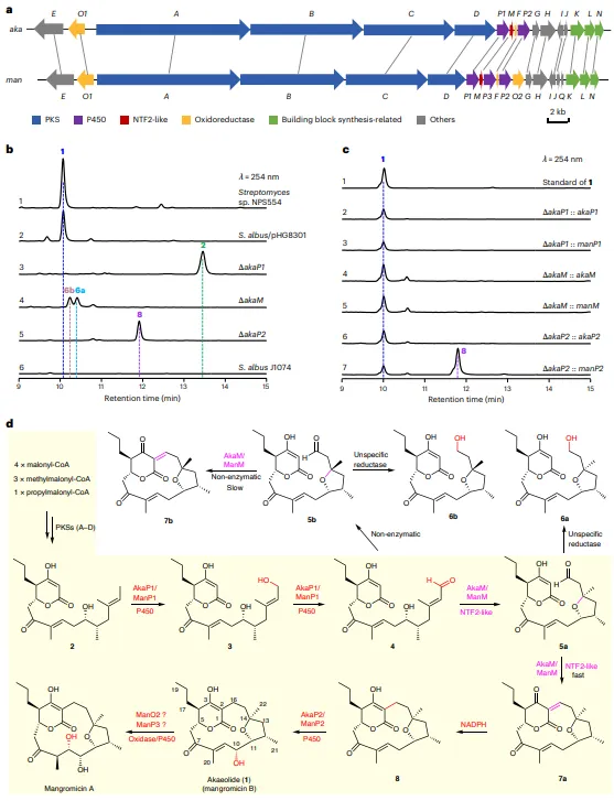 图1:AKA(1)的生物合成。a,链霉菌属NPS554的AKA生物合成基因簇及其在气生李氏杆菌NBRC 13195中的同源基因簇MAN的基因组织结构。b,来自链霉菌属NPS554 (1)、S. albus/pHG8301 (2)、突变株(3–5)和S. albus J1074 (6)的代谢提取物的HPLC分析。c,回补株代谢提取物的HPLC分析。d,本研究中提出的1和MAN的生物合成途径。主途径以阴影背景突出显示。1的绝对立体化学先前已通过X射线晶体学分析确定。