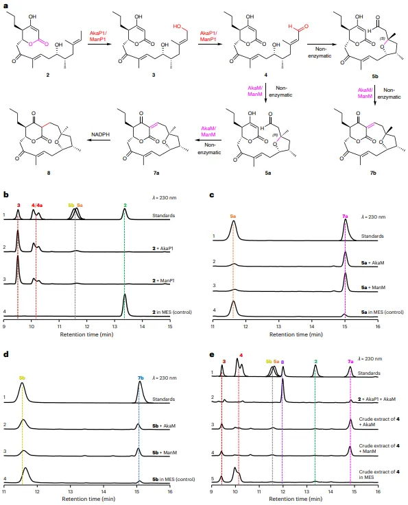 图2:AKA和MAN的大环化过程。a,由AkaP1/ManP1和AkaM/ManM催化的连续氧化和环化过程。b,AkaP1或ManP1催化反应的HPLC分析:(1) 2, 3, 4/4a, 5a和5b标准品;(2,3) 使用2为底物的AkaP1和ManP1体外酶促反应;(4) 2在无酶缓冲液中。c,AkaM或ManM催化的大环化反应的HPLC分析:(1) 5a和7a标准品;(2,3) 使用5a为底物的AkaM和ManM体外酶促反应;(4) 5a在无酶缓冲液中。d,AkaM或ManM催化的大环化反应的HPLC分析:(1) 5b和7b标准品;(2,3) 使用5b为底物的AkaM和ManM体外酶促反应;(4) 5b在无酶缓冲液中。e,AkaM或ManM催化的串联环化反应的HPLC分析:(1) 2, 3, 4, 5a, 5b, 7a和8标准品;(2) 使用2为底物的AkaP1和AkaM体外一锅法酶促反应;(3,4) 使用4的粗提物为底物的AkaM或ManM体外酶促反应;(5) 4的粗提物在无酶缓冲液中。
