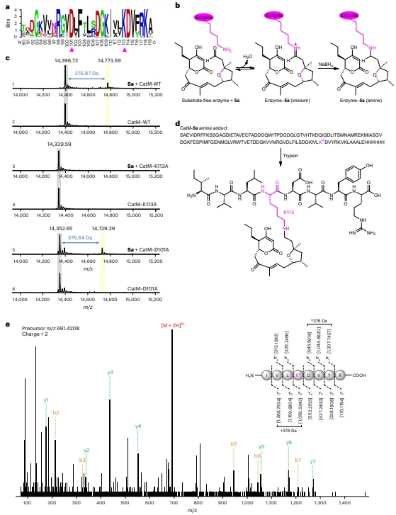 图4:大环化反应中涉及的亚胺离子催化。a,聚酮相关NTF2样蛋白C端序列的WebLogo图。保守的催化残基用洋红色三角形标出。b,亚胺离子中间体捕获过程。c,与5a孵育并经NaBH4处理后的CatM及其变体(K113A和D101A)以及无底物蛋白的质谱分析。d,通过胰蛋白酶消化获得的CatM–5a胺加合物的跨越110–117残基的肽片段。洋红色突出显示的K*对应于通过还原胺化与醛5a连接的赖氨酸残基(+376 Da)。e,八肽片段的LC–MS/MS碎裂图谱。谱图中标记并列于扩展数据表1中的前体离子、b离子和y离子。残基编号遵循CatM的序列。