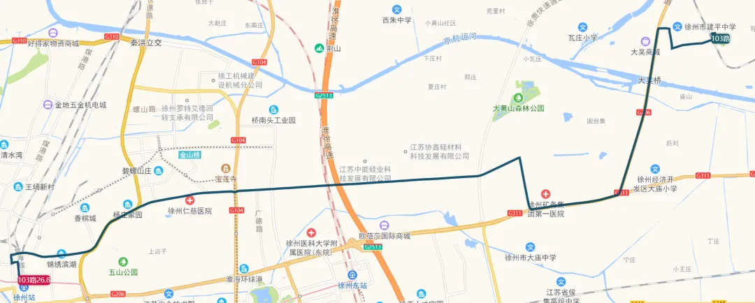 旗山矿,湖里二期,星港小区南门,星港小区西门,建平,大吴,解台,虎山,安然村,大黄山矿一院,大黄山,美家园(矿一院西门),大黄山社区医院,立本学院(前王路口),前王村委会,淮海未来城,大黄山镇政府,中能硅业,波司登,青岛啤酒厂,蟠桃花园,杨山路公交首末站,旺旺家园,仁慈医院,开发区中学,桃园小区,金山桥路口(金贝庄园),锦都汇小区,香山物流(三环东路),响山路东,响山,地下道(响山路),四道街,徐州站 13